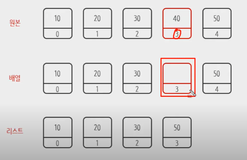 마찬가지로 배열의 경우는 정해진 공간이 있기 때문에 데이터는 사라지더라도 인덱스는 유지가 되지만, 리스트의 경우는 인덱스와 함께 데이터가 사라진다.