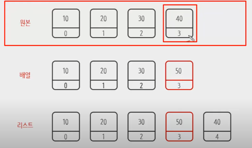배열의 경우는 정해진 사이즈가 있기 때문에 40이라는 데이터가 대체되어버리지만, 리스트의 경우는 새롭게 데이터가 추가가 되고, 기존의 인덱스3의 데이터는 뒤로 밀려나게 된다.