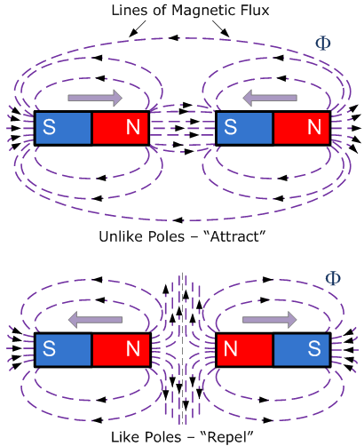 All magnets, no matter what their shape, have two regions called magnetic poles with the magnetism both in and around a magnetic circuit producing a definite chain of organised and balanced pattern of invisible lines of flux around it.