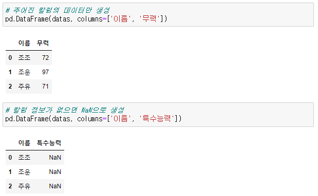columns를 이용해 특정 칼럼의 데이터만 생성할 수도 있다. 딕셔너리에 없는 칼럼 정보가 전달되면 NA 값으로 데이터를 생성한다.
