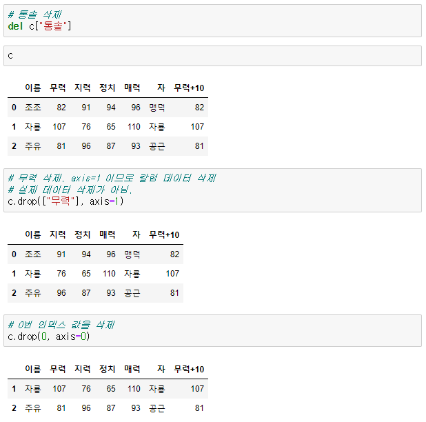 삭제를 할 때는 del 혹은 drop()을 이용한다.