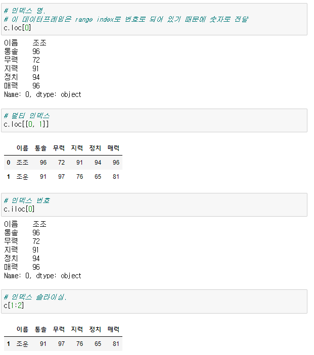 loc는 인덱스명을 이용하고, iloc는 인덱스 번호를 이용.