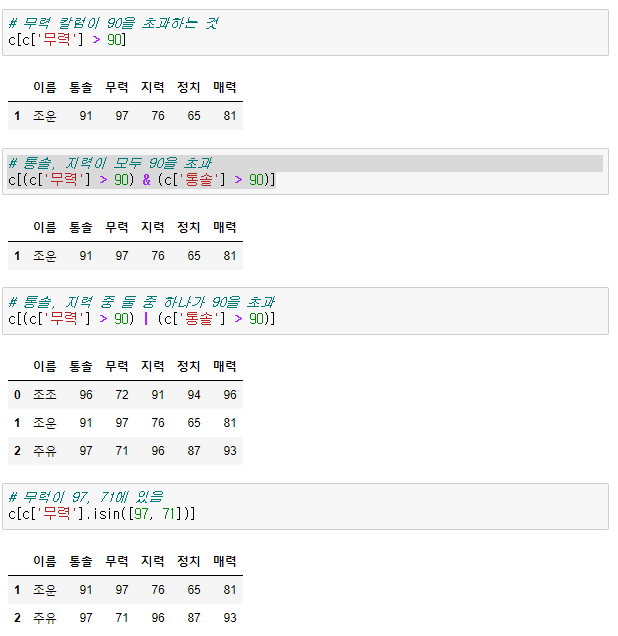 AND(&), OR(|) 조건을 이용하거나 isin()을 이용해서 특정값을 찾을 수도 있다.